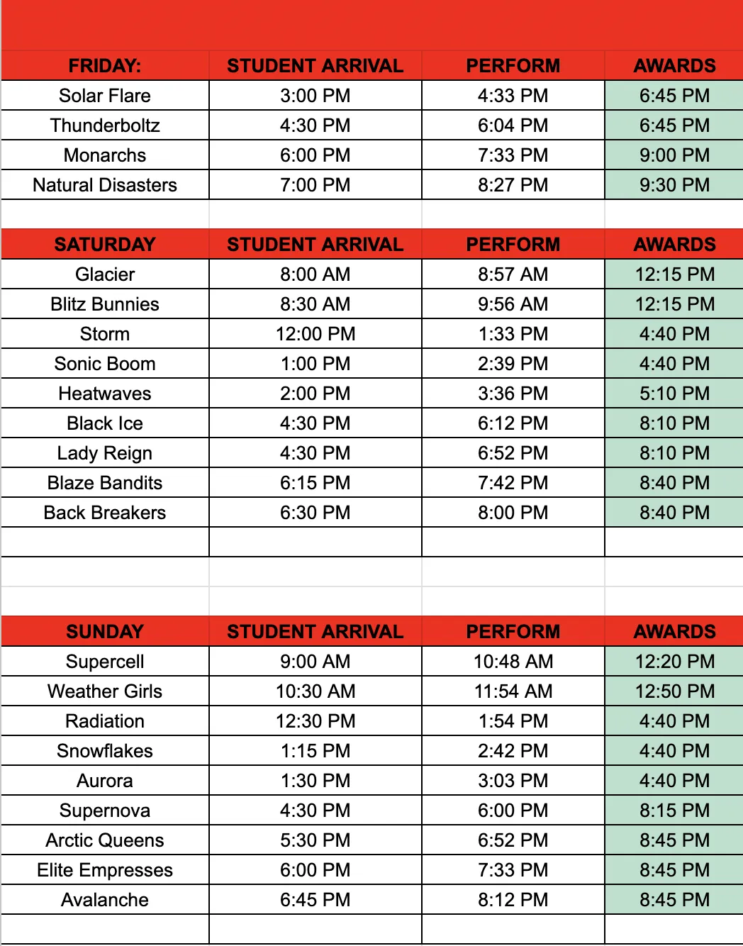 Each team has their own specific arrival time. It is really important that you arrive on time, as this is when the team runs through their routines and prepares with their coach before heading backstage. We will post the meeting spot on Band, so please make sure you are on the app. All students need to come with full hair and makeup, dressed in their costume.